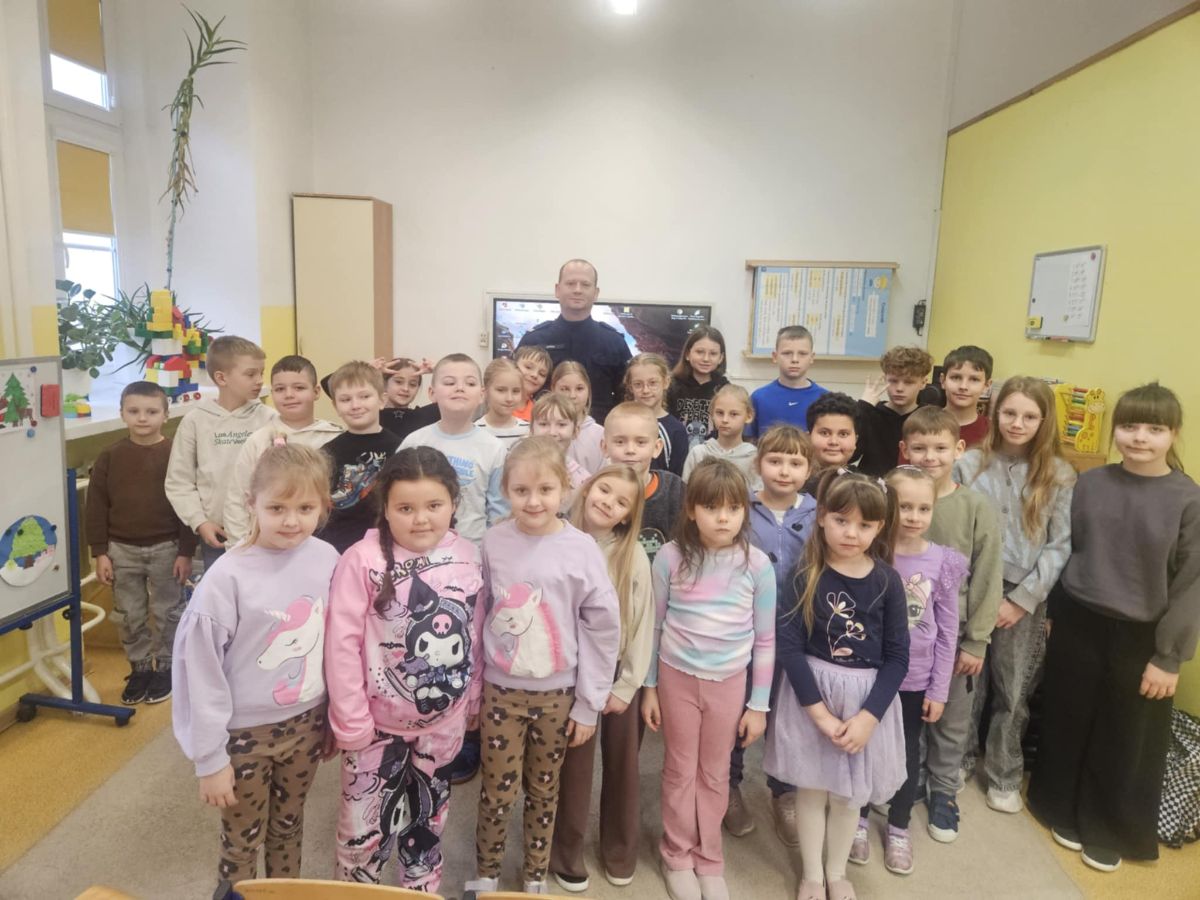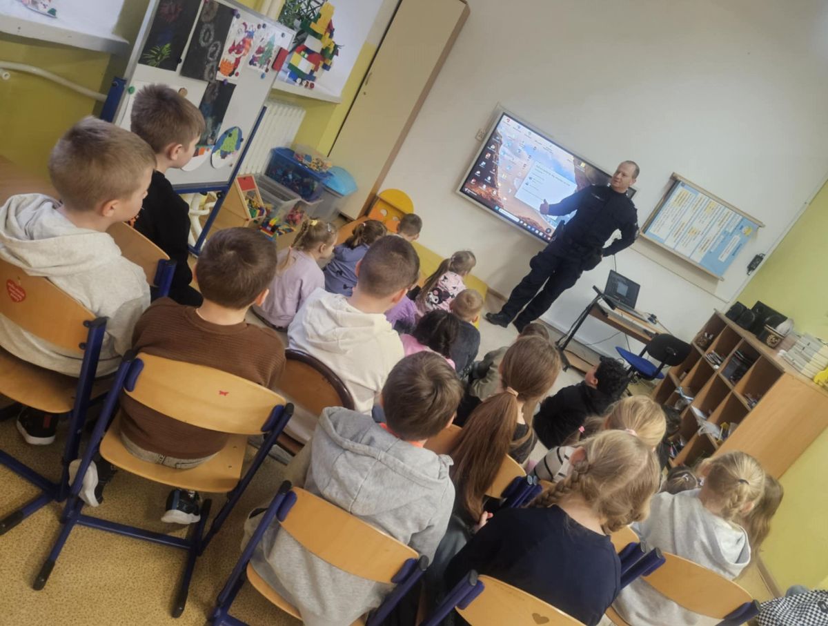 W trosce o bezpieczeństwo uczniów w naszej szkole odbyło się wyjątkowe spotkanie z funkcjonariuszem Policji, poświęcone zasadom bezpiecznego spędzania ferii zimowych. Wizyta miała na celu przypomnienie dzieciom najważniejszych zasad, które pomogą im uniknąć niebezpiecznych sytuacji podczas zimowego wypoczynku. Podczas spotkania policjant omówił zagrożenia związane z zabawami na śniegu i lodzie, szczególnie przestrzegając przed wchodzeniem na zamarznięte zbiorniki wodne. Uczniowie dowiedzieli się również, jak bezpiecznie korzystać z sanek, nart czy łyżew oraz dlaczego tak ważne jest noszenie elementów odblaskowych po zmroku. Nie zabrakło praktycznych wskazówek dotyczących wzywania pomocy oraz przypomnienia numerów alarmowych. Dzieci aktywnie uczestniczyły w spotkaniu, chętnie odpowiadały na pytania i dzieliły się swoimi doświadczeniami z zimowych zabaw. Dzięki takim inicjatywom uczniowie nie tylko poszerzają swoją wiedzę, ale przede wszystkim uczą się odpowiedzialności za siebie i innych. Mamy nadzieję, że tegoroczne ferie będą dla wszystkich czasem radosnym, a przede wszystkim bezpiecznym.