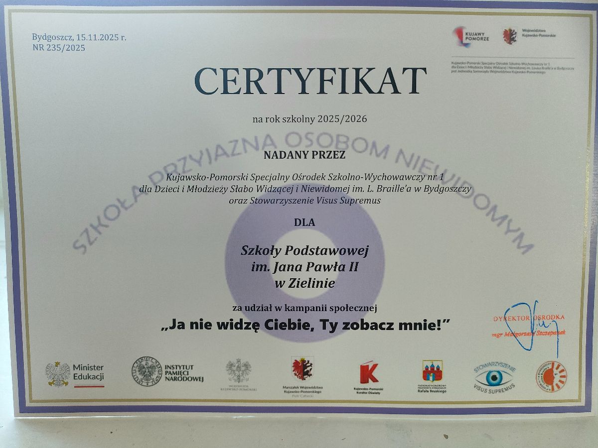 Nasza szkoła otrzymała Certyfikat za udział w kampanii społecznej ,,Ja nie widzę Ciebie Ty zobacz mnie” jest to akacja promująca działania mające na celu podniesienie świadomości społecznej w śród dzieci i dorosłych na temat wyzwań osób niewidomych i słabowidzących, promowanie empatii, eliminowanie barier architektonicznych i mentalnych oraz wspieranie samodzielności i integracji tych osób, tak aby wszyscy widzieli w nich pełnoprawnych i niezależnych członków społeczeństwa, a nie tylko problemy.