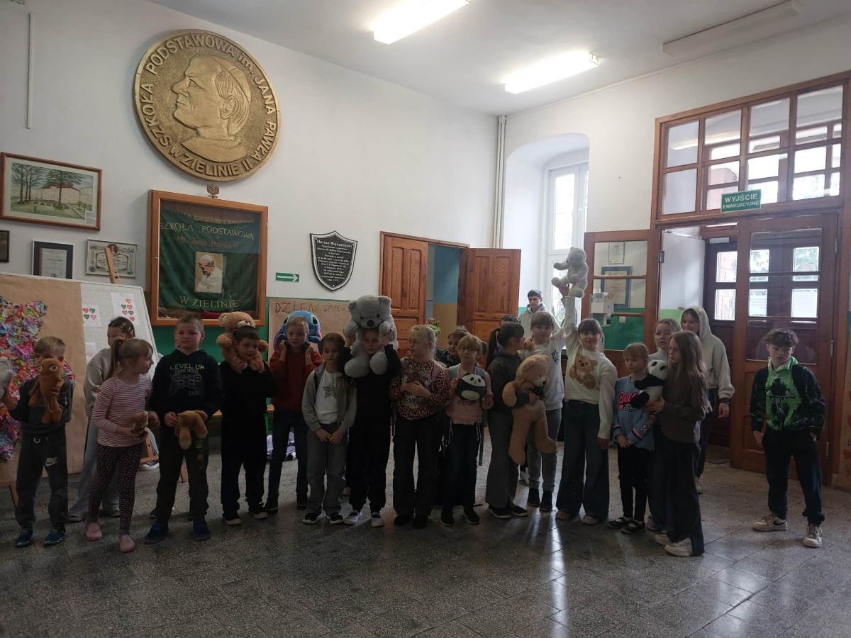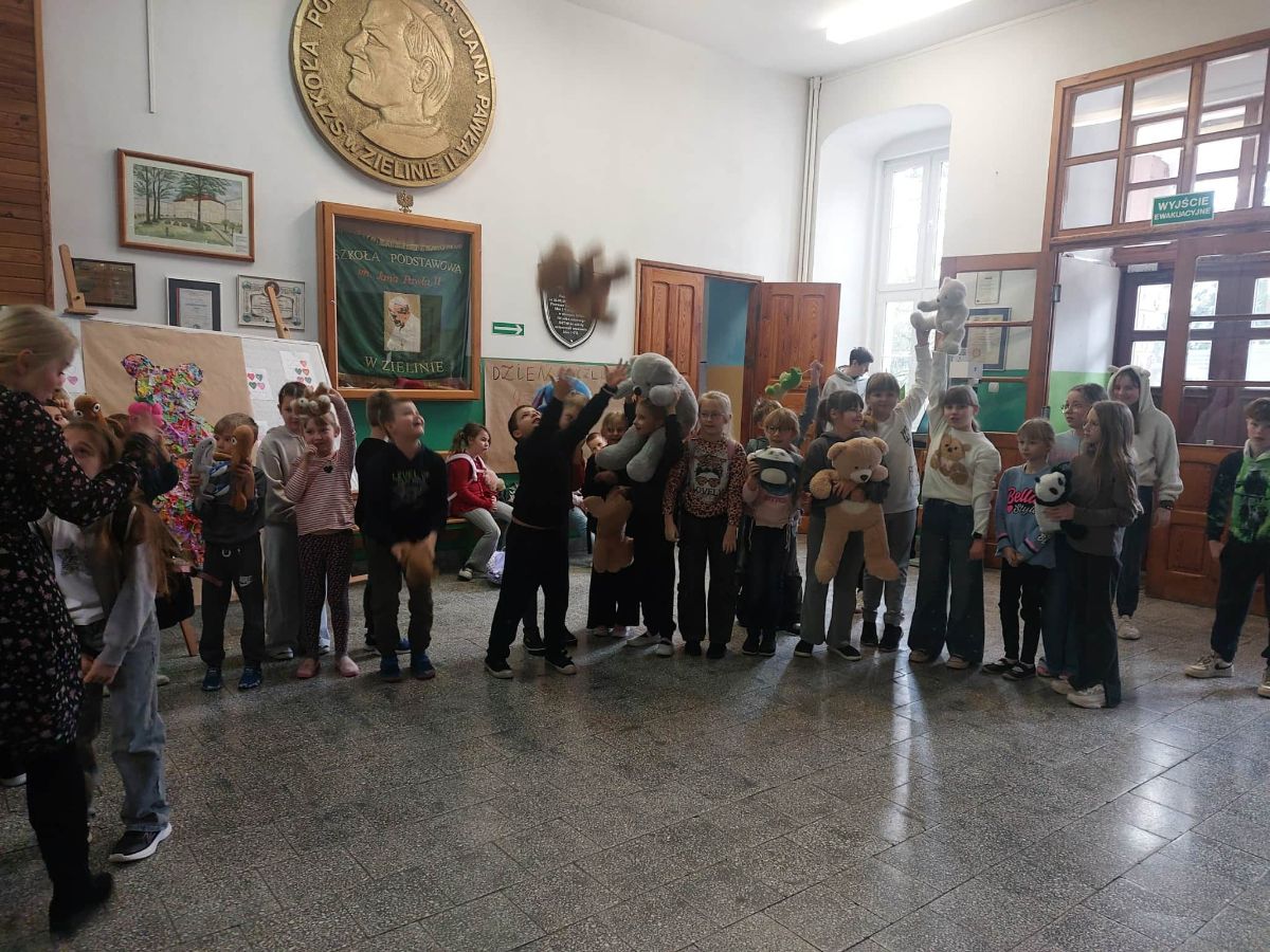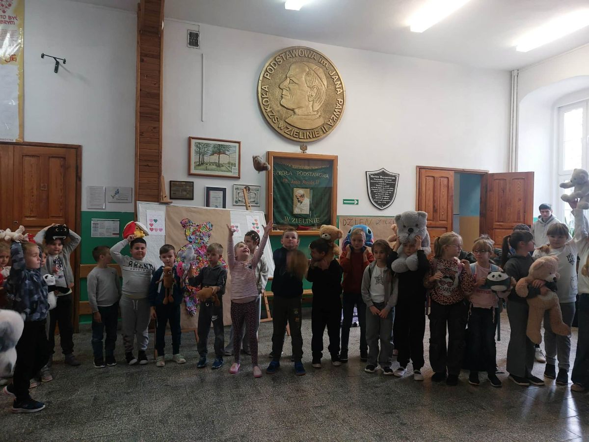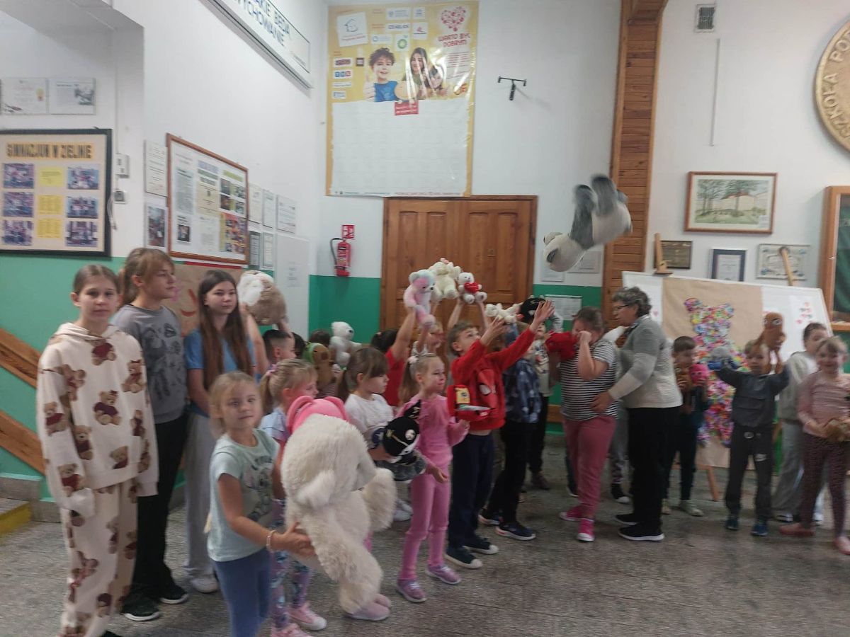 Obchody Dnia Pluszowego Misia w naszej szkole rozpoczęły się od uroczystego powitania dzieci i ich pluszowych przyjaciół. Następnie dzieci wzięły udział w misiowych zabawach i konkurencjach. Wspólnie stworzyły Misia za pomocą kolorowej bibuły oraz zaśpiewały w holu szkoły piosenkę ,,Pokochaj pluszowego misia”.