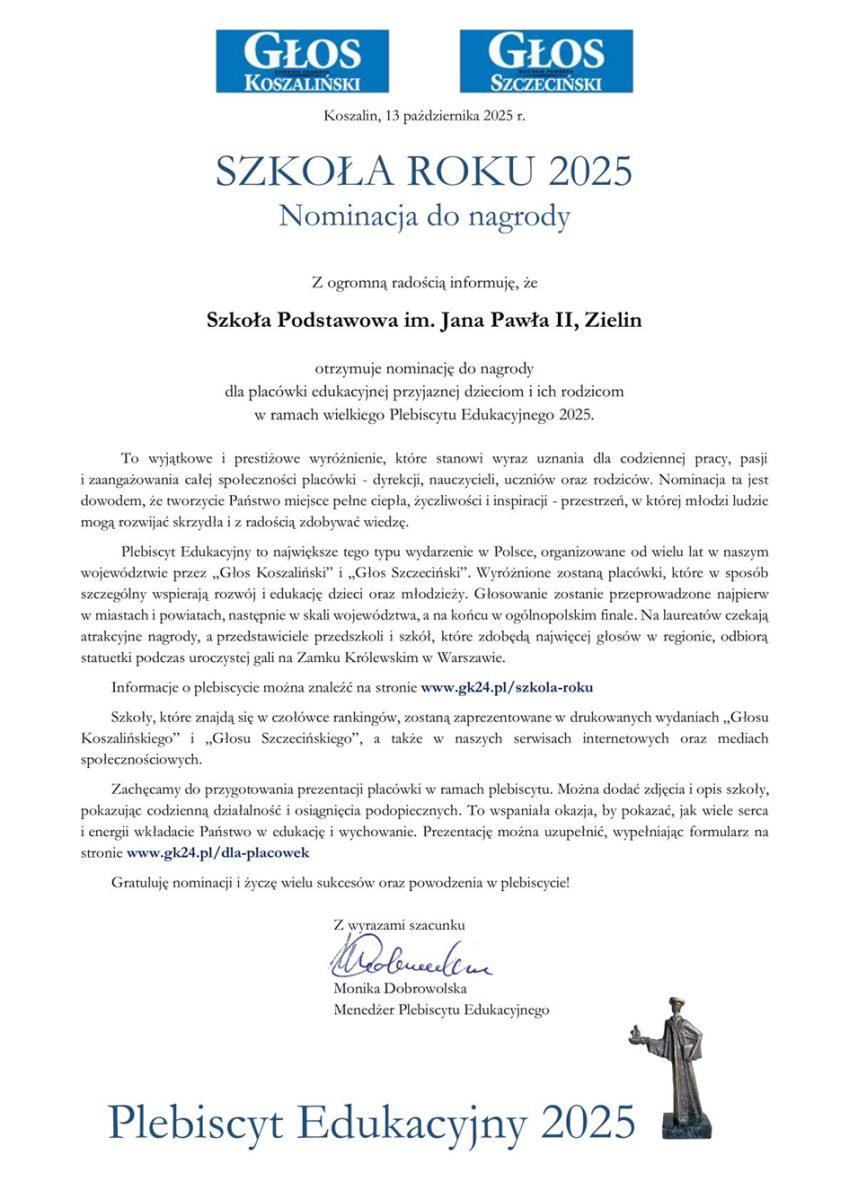 Redakcja „Głosu Koszalińskiego” i „Głosu Szczecińskiego” poinformowała nas, że nasza placówka edukacyjna została zgłoszona do nagrody w kategorii Szkoła Roku w tegorocznej edycji Plebiscytu Edukacyjnego 2025.